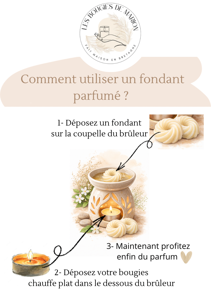 - Fondant fabriqués à base de cire de soja et de parfum de Grasse pour certains fondants, colorés avec du colorant en grain à base d'aniline. Ne contient pas de substance CMR / sans cruauté animale.