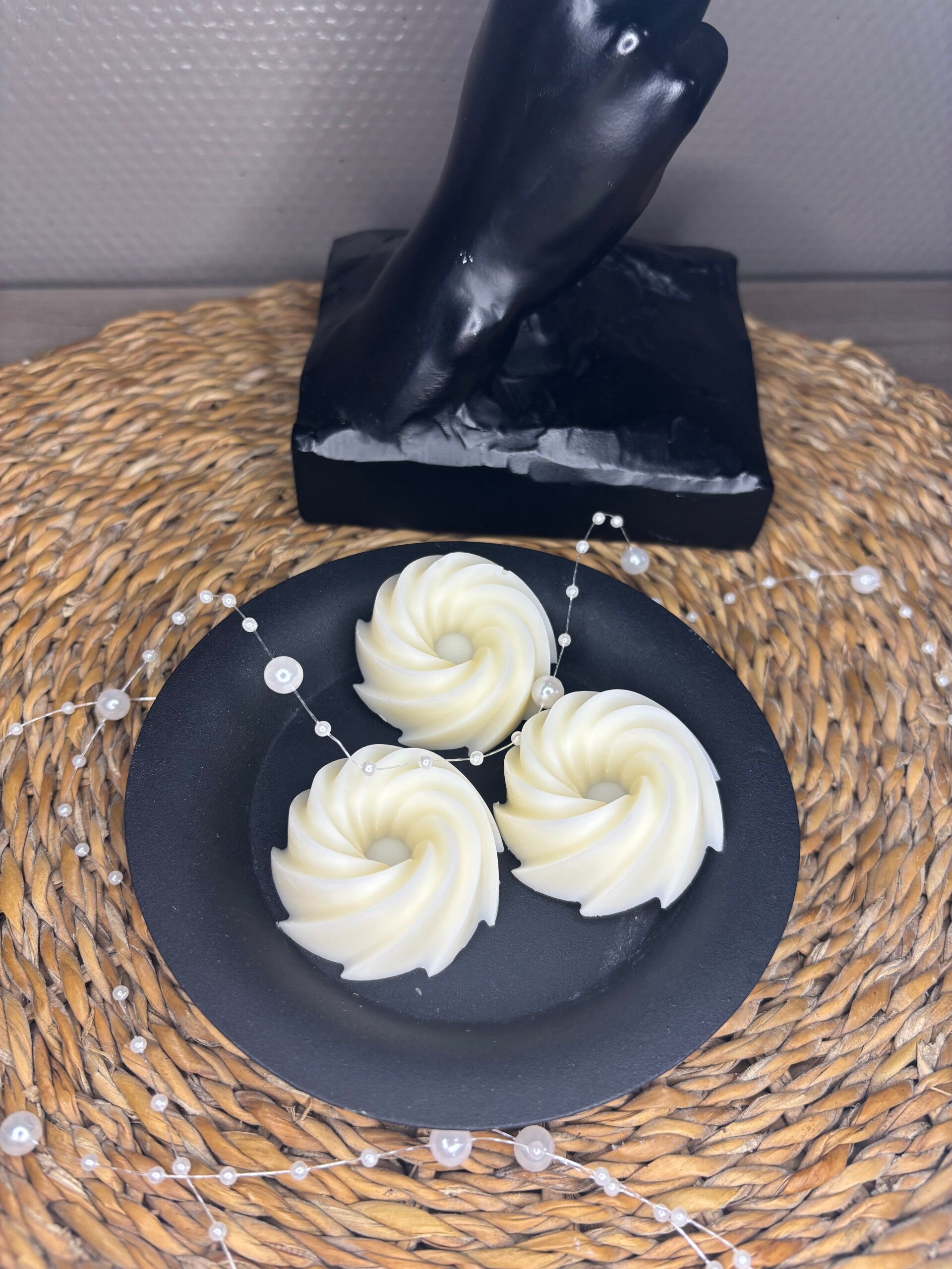 - Fondant fabriqués à base de cire de soja et de parfum de Grasse pour certains fondants, colorés avec du colorant en grain à base d'aniline. Ne contient pas de substance CMR / sans cruauté animale.